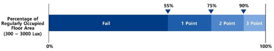 The EC louver can operate in a total of three states: (1) when louvers are open horizontally; (2) when all louvers are closed; and (3) when only the uppermost louver and the lowest louver are open to create a stack effect. In this study, the indoor daylight performance was analyzed for both horizontally open louvers and closed louvers. The evaluation criterion was set to LEED v4.1 daylight option 2 mentioned in research methodology. Score is given as shown in Figure 2 according to the ratio of the indoor floor area achieving 300 lx to 3000 lx for the equinox at 9:00 a.m. and 3:00 p.m. [21].