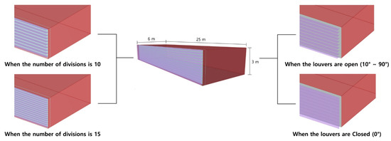 In order to analyze the effects of louvers on an indoor environment, LEED daylight evaluation and prior research were investigated. LEED certification is the most commonly used eco-friendly building certification system in the world, which has been continuously developed from LEED v1 to LEED v4.1. Previous LEED v2 [19] certifications only required an indoor daylight intensity of 25 fc, which must be secured at a minimum. However, too strong a daylight can have negative effects, so the concept of uniformity had evolved into a concept. In LEED v3 [20], the standard had been changed from 10 fc to 500 fc. The most recent LEED v4.1 provides three evaluation methods [21]. For option 1, it is assessed through spatial daylight autonomy (sDA) and annual sunlight exposure (ASE). sDA is an assessment of whether a space receives at least 300 lx of sunlight during standard operating hours of one year. ASE is a measure of the proportion of floors that receive more than 250 h of direct sunlight exceeding 1000 lx. For option 2 and option 3, it is evaluated how much the illuminance of the indoor floor area achieved 300 lx to 3000 lx at a 9 a.m. and 3 p.m. in the equinox. The range of 300–3000 lx is derived from a useful daylight illuminance (UDI). Option 2 is evaluation by simulation and option 3 is evaluation by actual measurement. The use of LEED’s evaluation index is valid because louvers are devices that can assist daylights installed to control high solar heat and light. In addition, studies have been conducted on several indicators to evaluate indoor lighting performance when using louvers. In the study of Lee et al. [22], daylight autonomy (DA) and UDI were analyzed for four types of louvers (horizontal, vertical, eggcrate and overhang). In the study of Bouberkri and Lee [23], daylight factor (DF), mean hourly illuminance (MHI), DA, and UDI were compared among horizontal, vertical, and overhang types of louvers.