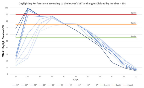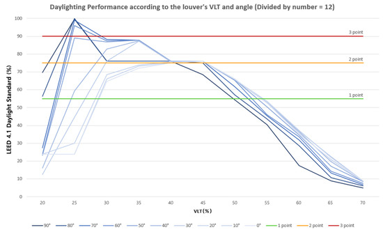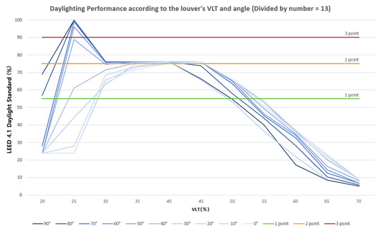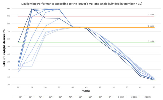 LEED v4.1 daylight option 2 simulation was performed on the set model and method, and the following results were obtained. When the number of louvers is 10, there are a total of 11 cases in which three points (over 90% of the floor area that achieved the corresponding illumination) can be obtained for LEED v4.1 daylight option 2. When the VLT is 25%, three points can be obtained for rotation angles of 90°, 80°, 70°, and 60°. With a VLT of 30%, it was possible to achieve three points at 70°, 60°, 50°, and 40°. When VLT was 35%, it was possible to obtain three points for rotation angles of 60°, 50° and 40°. There were a total of 25 cases in which two points (75% or more of the floor area that achieved the illuminance) could be obtained. In LEED v4.1 daylight option 2, there were 36 cases in which a score of 2 or more could be obtained. Results are shown in Table 4 and Figure 5.