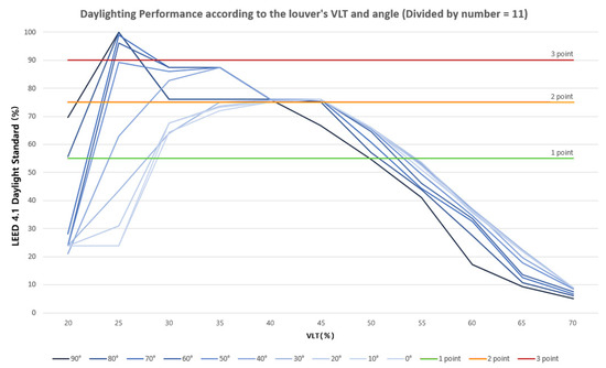 Table 5 and Figure 6 show target illuminance achievement rates when the number of louvers is 11. When the VLT was 25%, there were only four cases in which three points could be obtained: 90°, 80°, 70°, and 60°. There were a total of 33 cases where two points could be obtained. There were 37 cases in which two or more points could be obtained.