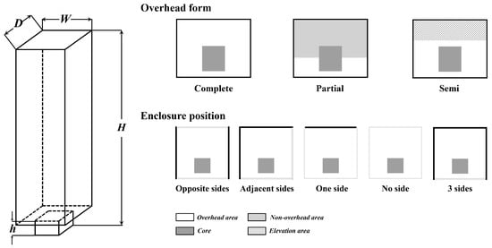 | Width (W) | Depth (D) | W/D | Number and Continuity | Overhead Form | Height (h) | Enclosure Position | Openness Degree | |