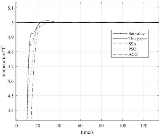 In order to verify the effectiveness of the proposed method, the proposed method was compared with the sparrow search algorithm, particle swarm optimization algorithm and ant colony optimization algorithm. The control method adopted was temperature difference control. The temperature difference between the supply and return water of the chilled water was set at 5 °C. The sampling time of the system was 0.5 s. The three parameters of the PID controller had an upper limit of 5 and a lower limit of 0. The group size of the swarm optimization algorithm in this paper was 50, and the maximum number of iterations was 100. Other parameters of the group algorithm were set as follows: