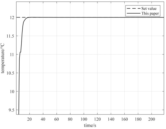 From the perspective of control performance, the method proposed in this paper performed better than the control in [13] in both the rise time and adjustment time. The rise time was 2.713 s, and the adjustment time was 4.95 s. The control method proposed in this paper has a fast response speed, and its stability was improved accordingly. In view of the hysteresis of chilled water system, this method can improve the response speed of the controller.
