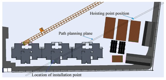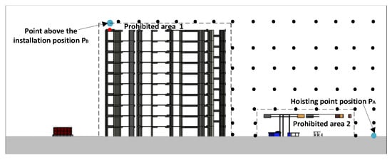 In order to meet the requirements of the route optimization algorithm for highly abstracted construction site environments, this study proposes a plane model method which simplifies the DT-BIM model into a hoisting path-oriented model. The plane model facing the hoisting path is presented in the form of a spatial topology structure. The vertical hoisting plane model is established through the hoisting position of the PCs and the installation position of the PCs, which mainly includes the hoisting point of the PCs, the installation position of the PCs and the layout relationship of buildings and adjacent facilities, as shown in Figure 3.