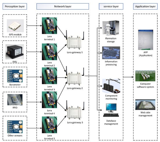 Based on the LoRa WAN network architecture, this study establishes the construction and hoisting site monitoring method architecture. LoRa technology is used for the wireless transmission of physical entity attitude information and position information during hoisting. In this study, the hoisting control terminal based on LoRa technology is used to transmit the information and data in the hoisting process wirelessly. The device has a variety of sensor interfaces, external IMU, GPS, barometer, etc. IMU collects attitude information, including acceleration, velocity, swing, etc., during the hoisting of PCs. IMU, GPS and barometer are used to collect the position information of PCs in the hoisting process through the fusion positioning algorithm. The collected information is transmitted in real time via the LoRa chip to the LoRa gateway, where it is uploaded to HDD. The connection between HPE, HDD and HSP is established through information collection, transmission and processing and the real-time feedback mechanism is established for visual display. As shown in Figure 5, the monitoring method architecture is mainly composed of perception layer, network layer, service layer and application layer. The perception layer refers to the information collection of the hoisting site through IMU, GPS, barometer, RFID tag and other sensors and information uploading through the LoRa terminal device. The network layer refers to the real-time and accurate transmission of the information collected by the perception layer through the LoRa network. The information collected by the perception layer is transmitted to the gateway through the LoRa WAN protocol and then to the service layer through the gateway. In the service layer, database technology is used to store and process the collected information, including component attribute information, hoisting monitoring information, etc. The information in the service layer can be displayed on apps and web pages through mobile phones, computers and other devices.