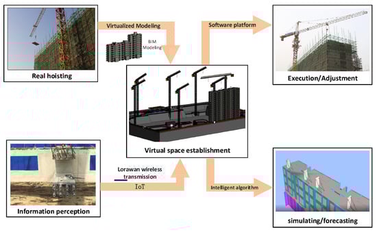 Based on the concept of DT, this study establishes the connection between HPE and HVE through HDD and HSP and realizes the real-time interactive feedback between the real physical environment and the virtual digital environment. In the hoisting control management system established in this study, HPE mainly includes construction site environmental entities, PC entities, tower cranes and operators. The construction site environmental entities and PC entities are modelled and digitized by virtual entities through BIM modelling. The virtual digital environment also includes the collection of a variety of data by a variety of sensor devices, including attitude information data and position information data, and uploads to HSP through information transmission technology. By combining the HVE data of PCs for data processing, visual presentation is carried out in HSP. The position and attitude information displayed by the tower crane operator is used to assist decision making and operation, and real-time interactive feedback between HPE and HVE is realized. The information collection of PCs in the hoisting process adopts the Inertial Measurement Unit (IMU), GPS, RFID tag and other sensors. HPE should be adjusted accordingly with the change in HPE. If the building floor increases gradually, the hoisting virtual entity should be updated according to the actual change.