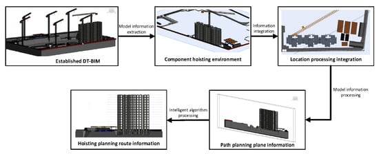 Although information technology is widely used in the construction management of prefabricated buildings, the application of DT technology in the construction management of prefabricated buildings is seldom studied. Moreover, because of the complexity of construction and hoisting sites of PCs, it is impossible to collect and analyze the hoisting path and process information in real time. Additionally, because the management system of on-site construction hoisting cannot be combined with the existing virtual model layout, the management of construction hoisting still remains in the way of workers’ communication and dialogue. Thus, the construction site process cannot be better displayed. To solve these problems, this study uses BIM, IoT and other technologies to establish a DT model for the hoisting management of PCs. Meanwhile, the model was used to conduct meaningful investigations and the results are as follows: (1) According to the DT model, the system framework of construction hoisting management was established to realize the real-time interactive management of PC hoisting. (2) This study verified the feasibility of using Dijkstra’s algorithm to plan the hoisting path of PCs based on the established virtual model. (3) According to the system framework of virtual and real interactions, a method of real-time monitoring of the hoisting process of PCs is proposed to guide the management personnel in site construction. (4) Virtual model interactive management of PC hoisting management was realized to help site managers understand the location and related information of PCs. The method proposed in this study integrates DT, IoT, BIM and other technologies to improve the construction management level of prefabricated buildings, which is of great significance for future research.