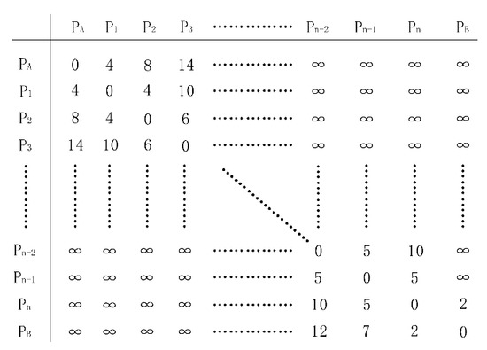 (2) If there is a node for the source point and the edge d (, ) that connects the two passes through the forbidden region (satisfies the forbidden condition function), then its path length is set to infinity. Meanwhile, if the slope of the side connecting source point to some node is less than 60 degrees, then the path length is set to infinity.