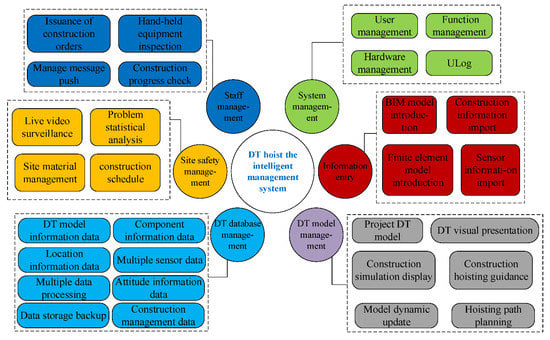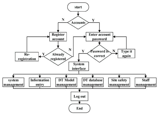 In the case study, the BIM hoisting model established was exported in IFC format, which was parsed and read in the JavaScript environment for extension and light-weight processing, and the developed interface was used for transmission and uploading to HDD. Additionally, sensor information was transmitted to the system and combined with the twin model for visual display, so as to realize the retrieving of model data on the system platform or software and the viewing of the overall environment affecting hoisting in the construction site. The access process of the web terminal system is shown in Figure 12. Through the functional analysis of the system platform, it mainly included eight functional modules, including staff management, system management, site safety management, information entry, DT database management and DT model management. The contents of each module are shown in Figure 13.