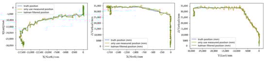 The precast floor numbered T1-11-2-3 in the case study established the hoisting route planning plane of the floor through the hoisting position and the installation position and determined the hoisting route of the precast floor through the path-planning algorithm of this study, as described in Section 4.2. The construction and hoisting of the prefabricated floor were conducted according to the path planned by the algorithm and hoisting control was conducted according to the prefabricated floor information transmitted during the hoisting process. After receiving the instruction from the construction site, the manager of the component yard transported the components out according to the information in the system and re-entered the working state through the control transmission module of handheld devices for the real-time transmission of information. According to the information in the RFID spreader selection, floor ring inspection and other work, the correct hoisting needed to be checked. According to the information collected by the LoRa terminal during the hoisting process, the tower crane operator could view the real-time information of the components on the equipment and check the deflection, tilt angle and position information of the components during the hoisting process. The collected position information was processed and compared with the Kalman filtering effect, as shown in Figure 14. The position information directly measured by the sensor had a large error, especially the position of multiple projections. By comparing the position information of the three planes, it was found that the positioning accuracy was improved to a certain extent after the Kalman filtering correction of various sensors. By monitoring the location information of PCs, the tower crane was controlled timely to ensure that the components were lifted accurately to the installation point of prefabricated floor, thus improving the safety and visibility of the whole hoisting process.