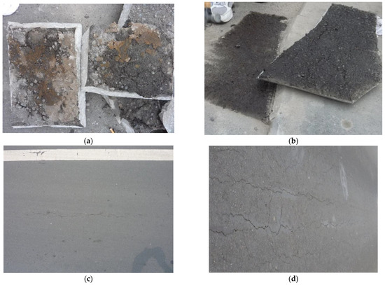 Delamination and cracking of the paving layer: (a) Early stage of longitudinal cracking of epoxy asphalt paving; (b) Longitudinal cracking and web cracking of epoxy asphalt paving; (c) Condition of binder layer for paving delamination cracking; (d) Damp condition of binder layer for paving delamination and cracking.