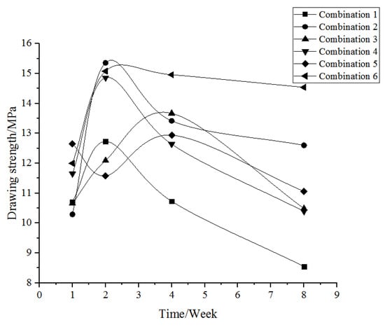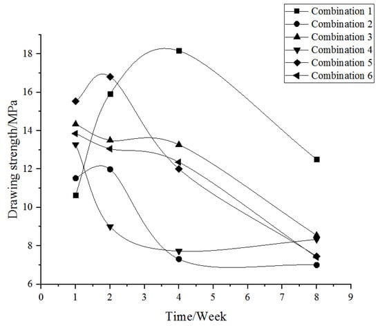 The results of the room temperature water bath are shown in Figure 8. In the room temperature water bath environment, with the increase of water bath time, the drawing strength of all other combinations increased first and then decreased except for combination 5. However, the pulling strength of combination 2 and combination 6 in the eighth week was still higher than the pulling strength in the first week, and the pulling strength of the other combinations in the eighth week was slightly lower than the pulling strength in the first week.