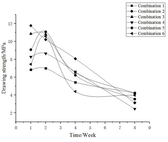The results of the 60 °C water bath are shown in Figure 10. In the 60 °C water bath environment, the initial values of the pull-out strength of combination 3 and combination 5 are slightly higher than those of the other combinations. As the salt bath time increased, the pull-out strength of combination 5 showed a gradual decrease, and the other combinations showed a trend of increasing and then decreasing. Combination 2, combination 3, combination 5, and combination 6 still had a high pull-out strength in the second week, but all showed an increased decay after 2 weeks.