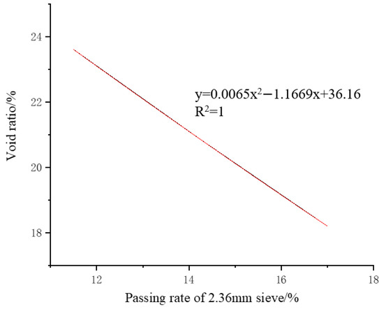 According to Table 9, a plot of 2.36 mm sieve passage rate versus void fraction can be fitted (e.g., Figure 11). According to the fitted %, equation, the passage rate of 2.36 mm sieve in the grading curve of the drained epoxy asphalt mix was adjusted to synthesize grading curves with void ratios of 18%, 20%, 22%, and 24% respectively. Formed rutting slabs were subjected to water penetration tests and dynamic stability tests at 60 °C. The test results are shown in Figure 12. As can be seen from Figure 12, when the void ratio is at 18%, the water penetration coefficient can meet the required value, but is closer to the required value; when the void ratio is greater than 22%, the high-temperature stability of the mix is relatively poor, and under extreme loading conditions, the paving layer may show rutting disease. Comprehensive water infiltration coefficient and dynamic stability index, it is recommended that the void ratio of drainage epoxy asphalt mixture is controlled at 20~22%.