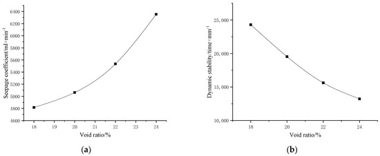 Relationship between void ratio and performance of drained epoxy asphalt mixture: (a) Diagram of void ratio versus permeability coefficient; (b) Diagram of void ratio and dynamic stability.
