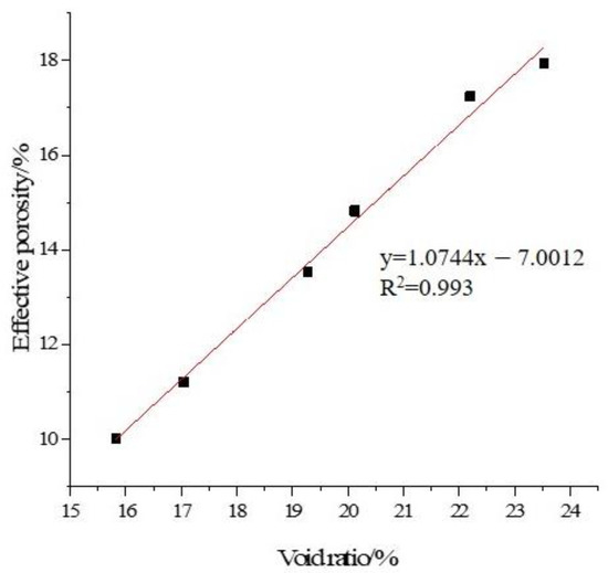 To be conservative, the thickness of the lower layer of the pavement was set at 4.0 cm and the void ratio was set at 18%, 20%, and 22% to calculate the time required to drain the water inside the pavement. When the parameters are set, the void rate should be finite, so it is also necessary to measure the void rate and the effective void rate, fit the relationship between the two, determine the effective void rate corresponding to 18%, 20%, and 22% of the void rate, the relationship between the void rate and the effective void rate graph as Figure 13.