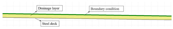 The upper layer of the paving is a dense-graded asphalt pavement with small voids, so there is no large amount of water infiltrating into the lower layer of the paving through the upper layer of the paving, and the lower layer of the paving is proposed to be an open-graded drainage type pavement with a larger void rate than that of the upper layer of the paving. When a small amount of water infiltrates into the lower pavement from the local area, the infiltrated water can move according to the cross slope of the bridge deck, and the infiltrated water can never fill up the lower pavement, so the lower pavement is always in a non-saturated state. The pavement subgrade is in an unsaturated state, i.e., the interior of the pavement substructure is a state where gas, liquid, and solid forms co-exist. In this state, the seepage of asphalt pavement is affected by load, temperature, seepage volume, and unsaturated suction, and the seepage forces are very complex [11]. This paper uses seepage analysis software to simulate the actual situation, as it is difficult to calculate the seepage situation in this state comprehensively and accurately.