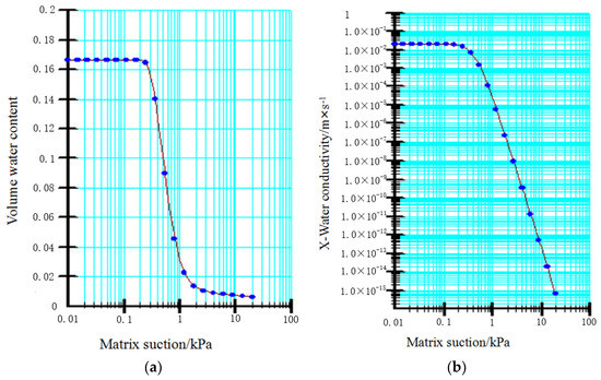Material parameter settings: (a) Volumetric water content function; (b) Hydraulic conductivity function.