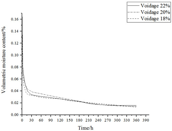 Based on the results of the analysis, the variation of the volumetric water content inside the paving layer at a distance of 12.5 m from the center with time is given in Figure 16. It shows that the paving with 18%, 20%, and 22% void ratios are all able to drain 50% of the water inside the paving within 2 h, with excellent drainage capacity.