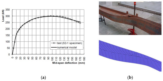 (a) Comparison of the numerical analysis results with the test results for the specimen S2-1 at 415 °C; (b) deformed shape of the steel beam at failure.