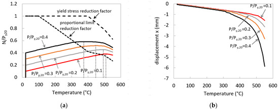 During the heating and cooling stages, fixed boundary conditions (all the degrees of freedom were fixed except from the displacement z at the top end of the column) were considered for all the columns. The axial degree of freedom at the top end of the column is restrained by the axial spring, representing the effect of the surrounding structure. According to the literature [38,39], the restraint experienced by a heated column (Equation (2)) varies between very low values (e.g., 0.001) to very high values (e.g., 0.2). In this section, the axial restraint is considered equal to 0.1. During the cyclic loading stage, the columns are free to translate axially and rotate at their top end, while all the other degrees of freedom are fixed.