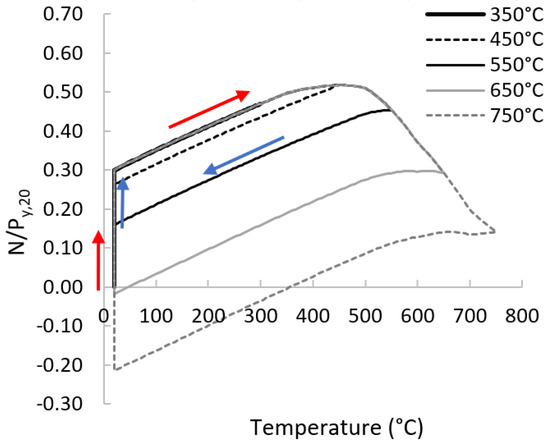 The axial forces developed in the HEB300_550 °C columns during the heating stage are presented in Figure 5. An increase in temperature results in thermal strain, which is partially prevented, generating thermal stresses and, therefore, the axial forces increase. The behaviour is linear elastic until the proportional limit is reached (482 °C, 397 °C, 378 °C, and 318 °C, for the columns HEB300_01_550 °C, HEB300_02_550 °C, HEB300_03_550 °C, and HEB300_04_550 °C). During the initial stages of heating, web and flange local buckling initiates. For further increases in temperature, the global out-of-plane displacements at the mid-height of the columns increase disproportionately and the buckling about the weak axis starts. At this point, the axial force takes its ultimate value and the temperature reaches its critical value (critical temperature). The critical temperatures are 509 °C, 493 °C, 447 °C, and 375 °C for the HEB300_01_550 °C, HEB300_02_550 °C, HEB300_03_550 °C, and HEB300_04_550 °C columns, respectively.