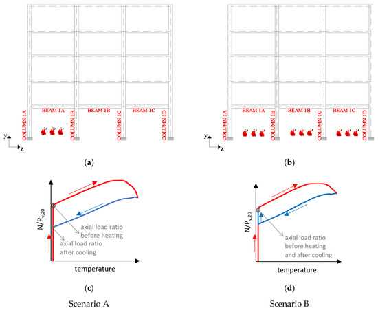 Fire scenarios and axial forces in Column 1B. (a) Fire scenario A; (b) Fire scenario B; (c) Dimensionless axial ratio for the Scenario A; (d) Dimensionless axial ratio for the Scenario B.