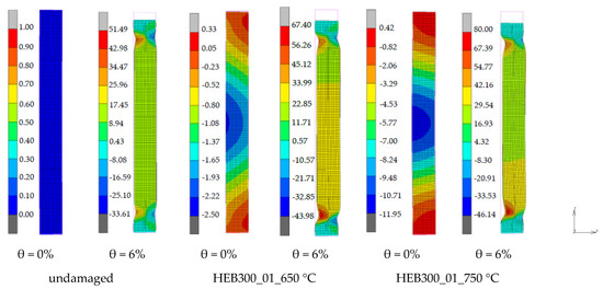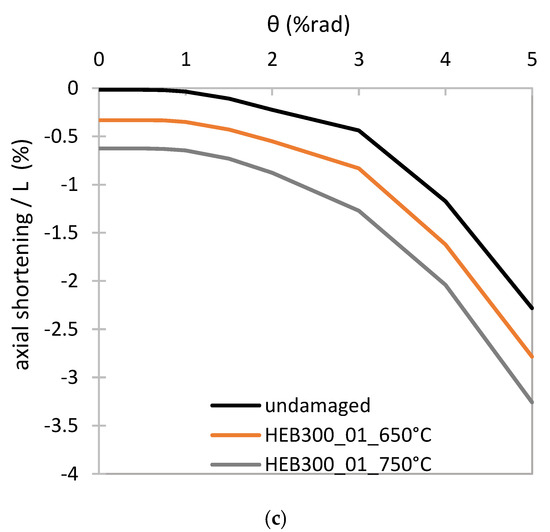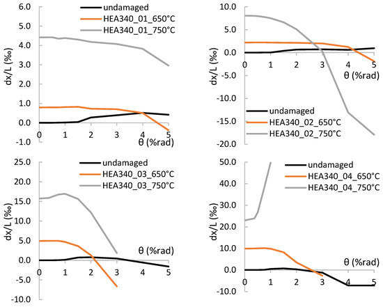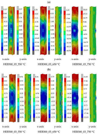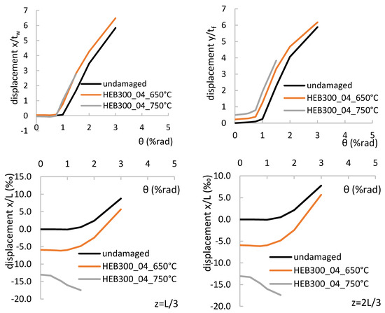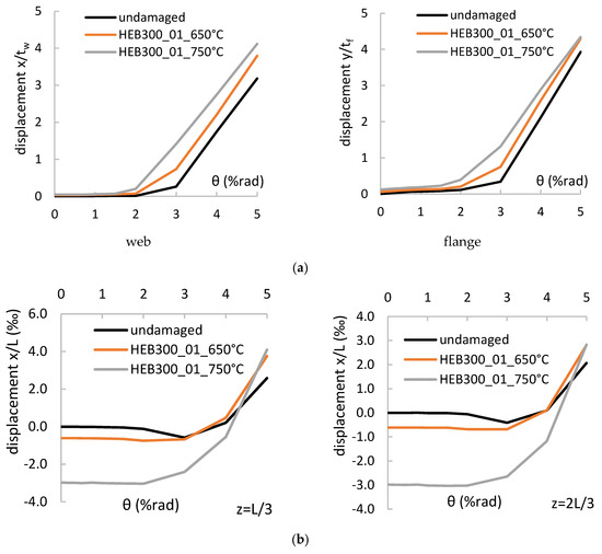 To obtain further insight into the behaviour of columns, Figure 12a,b compare the out-of-plane displacements in the columns HEB300_01_undamaged, HEB300_01_650 °C, and HEB300_01_750 °C. The plastic hinge at the base of the columns was formed during the second cycle of the 1.0% drift amplitude, in all the columns. The local web and flange buckling occurred during the first cycle of the 3.0% drift amplitude for the undamaged column, and this led to flexural strength deterioration. In the damaged columns, the local buckling waves, which were introduced due to the heating/cooling, are amplified during the cyclic loading. Initially, the out-of-plane displacements grow slowly, but during the first cycle of the 2.0% drift amplitude they start to grow rapidly, launching flexural deterioration. Note that the center of both the local flange and web buckling coincide in the undamaged and damaged columns.