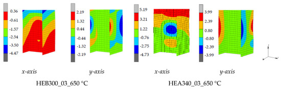 Emphasis is also placed on the base of the columns, where the plastic hinges are expected to be formed during the cyclic loading stage. Local buckling is critical because it may reduce the lateral restraint at column ends and trigger premature global instabilities [45]. Based on Figure 9, the flange local buckling waves are symmetric and antisymmetric with respect to the xz and yz planes, respectively. Their length is almost the same for both columns and their center is located at the same height from the base (1.25 d and 1.05 d for the HEB300 and HEA340, respectively). Two web local buckling waves appear at 0.45 d/1.1 d and 0.4 d/0.9 d from the base for the HEB300 and HEA340 columns, respectively. Note that the local buckling waves appear at the same locations for all the load levels and examined temperatures.