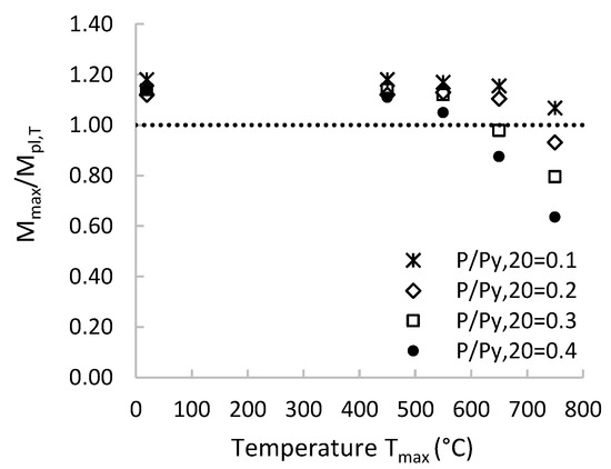 For the lowest loading level (P/Py,20 = 0.1) and Tmax = 650 °C, the reduction of the maximum moment of the first envelope curve was 7%, with respect to the undamaged column. This can be attributed to the reduced yield stress of steel (according to Equation (3) the reduction factor for the yield strength is 0.96) and the residual displacements. The maximum moment appears earlier for the damaged column (θMmax = 3% and 2% for the HEB300_01_undamged and HEB300_01_650 °C, respectively) and its rotational capacity (θMpl,20) is 10% reduced (Table 3). The reduction of the flexural capacity (i.e., the maximum deduced moment of the damaged column with respect to the undamaged one) is 16% for the HEB300_01_750 °C, while its rotation capacity is further reduced by 30% (Table 3).