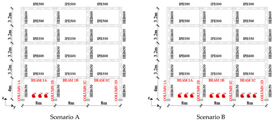 The scenarios of Figure 18 are examined. The fire is represented by the ISO fire curve, as defined in Eurocodes [12,50]. For the first scenario (Scenario A), the fire takes place at the left bay of the first story of the frame. For the second scenario, the fire starts from the left bay and when the temperature of the structural members returns to its ambient value, the fire expands to the next bay; in this way, it gradually spreads to the right bay. The temperature of the beams and columns is calculated according to the guidelines of EN 1993-1-2 [12], and it is uniform in the cross-section and along the length of all the structural members. The maximum temperatures for the columns and beams are 750 °C and 780 °C, respectively, for both scenarios. Both beams and columns are protected against fire using vermiculite cement (properties according to [51]) of 10 mm thickness. Preparatory analyses were conducted for the calculation of the critical temperature of columns, which was found to be equal to 640 °C.