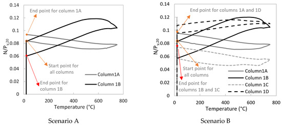 The axial forces for all heated columns during the fire stage are presented in Figure 20, for both the examined scenarios. A redistribution of forces takes place during fire. When the fire takes place at the left bay (Scenario A), the axial force ratio at the end of the cooling stage is different from its initial value (before heating) for both heated columns. When the fire spreads to the neighbour bays (Scenario B), the axial force returns approximately to its initial value for the interior columns (1B and 1C).