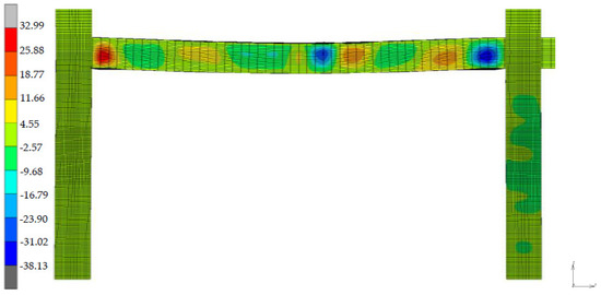 Deformed shape of the left frame of the first story (scenario A) and the x-displacement field (in mm).