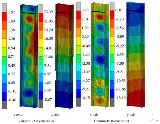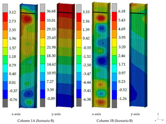 The post-fire deformed shape of the left bay of the frame is presented in Figure 21 (Scenario A). It is observed that the beam is severely damaged, while the columns are slightly damaged. Small web and flange out-of-plane displacements are detected for the heated columns and the global out-of-plane displacements are minor as well (Figure 22). As demonstrated in the same figures, residual (in-plane) global displacements appear in both columns for Scenario A. Their distribution is almost triangular along the height of the columns and the maximum value appears at their top end. These displacements appear due to the thermal expansion/contraction of the connected beam. During heating, a lateral force acts at the top end of the columns due to the restrained thermal expansion of the beam, which is connected at its top end. This force is reversed during cooling, but it is not eliminated, and the columns do not return to their initial position [8].