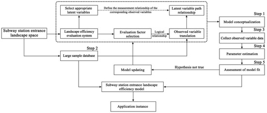 Regarding the landscape efficiency of subway station entrances, its dynamic fluctuation is related to periodic pedestrian volume. There are several landscape elements that directly affect the subway station entrance environment, some of which are abstract and complex in theory. In general, these elements are composed of a set of similar independent factors, which are non-observed factors or latent variables of landscape efficiency. In factor analysis, structure simplification of latent variables is an indispensable procedure to solve estimation problems [10]. As an effective multivariate statistical method, a structural equation model can verify the theoretical hypothesis relationship and the path loading between latent variables by setting a covariance matrix [11]. Compared with the SEM method, qualitative analysis such as questionnaires and case studies are still insufficient in the selection of evaluation indicators and verification of proposed evaluation system [12]. The SEM method can help researchers to improve model production efficiency and enhance the ability in response to academic controversies by providing a statistically verifiable framework and a graphical model [13]. At present, the SEM methods are widely used in performance investigation, such as public space governance and visual quality evaluation [14,15].