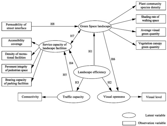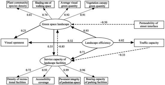 The composition relationship of the measurement model is relatively clear. Green space landscape can be interpreted by the four observed indicators (plant community species density, shading rate of walking space, average visual green quantity and vegetation canopy green quantity). The measurement of the service capacity of landscape facilities is derived from four variables (density of recreational facilities, accessibility coverage, pavement integrity of pedestrian space and bearing capacity of parking facilities). However, traffic capacity and visual openness contain only one observed variable: connectivity and visual level, respectively.