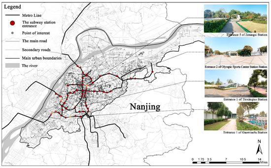 The main urban area is the core functional zone of Nanjing and it is also the area with the highest intensity of subway construction. At present, the railway lines distributed in the main urban area of Nanjing include Line 1, 2, 3, 4, 10 and S3, comprising 95 subway stations (including repeated transfer stations), of which 78 are underground stations, accounting for 82.1%. There are 320 subway station entrances in the main urban area, of which 230 are independent. It was investigated that the independent subway station entrances are located around main roads, close to residential areas, commercial plazas, city parks and core scenic spots. Their scales are concentrated in 400–1000 m2, which can basically meet the traffic needs of residents. However, there are some landscape problems at these subway station entrances, such as monotonous landscape form, right-of-way conflicts, high parking density, inadequate landscape facilities, and so on. Owing to the large quantities of subway station entrances in the downtown area, Nanjing has full potential to be regarded as the survey area.