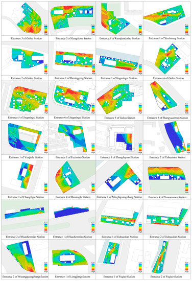 For the construction of the database, it was suggested to select over 100 samples for convergence degree and parameter stability [43]. Considering the construction situation of the existing independent subway station entrances in Nanjing, we finally selected 131 entrances as the survey samples, including Gulou subway station and entrance 6 of Jimingsi subway station (Figure 3).