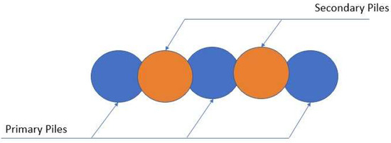 A secant pile wall is constructed by forming intersecting reinforced concrete piles, as shown in Figure 1. It can be reinforced with steel bars or steel beams, and is fabricated by drilling or augering based on the soil characteristics [29]. Primary piles are constructed first, and then secondary piles are placed in between them once the primary piles gain sufficient strength. Piles overlap, with a range between 7.5 to 12.5 cm [30].