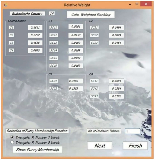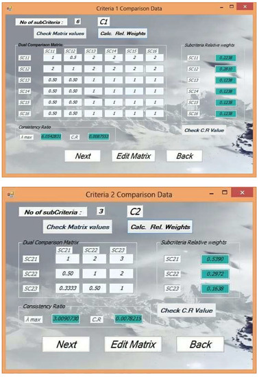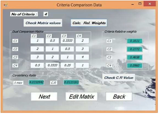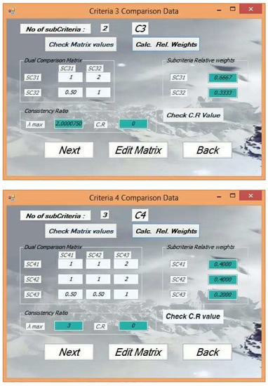As a first step, the AHP was conducted to compute the relative weights for all of the outlined four criteria and 14 sub-criteria. The experts’ preferences were introduced in the form of several comparison matrices. The results from this step are shown in Figure 6 and Figure 7.