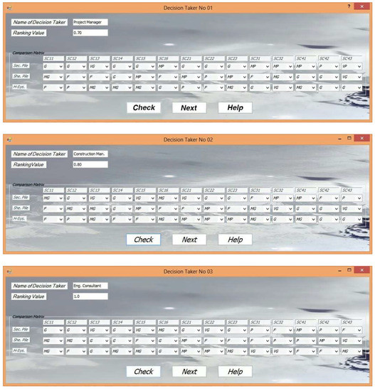 The decision-making group adopted TFNs “7” levels to get the benefit of applying linguistic variables in the decision-making process. Then, all alternatives were compared with the criteria affecting the decision. The experts’ preferences, which are defined throughout this stage, are shown in Figure 8. The decision-making members provided their individual judgments to a designed software where an aggregation technique was employed to synthesize their preferences. They also worked in close cooperation to make consensual judgements for each pairwise comparison matrix for the AHP procedures.