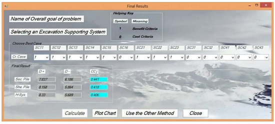 Finally, all criteria were assigned as being cost or benefit criteria. The cost criterion can be identified as the one that maximizes harm while minimizing benefits, whereas the benefit criterion is the criterion which maximizes the profits while minimizing the disadvantages. Then, was determined for each alternative to be ranked based on their values. The secant pile walls were chosen, mostly, with 0.441. Afterwards, the residual alternatives rank occupied the following positions with convergent preferences of 0.418 and 0.406, respectively, as shown in Figure 9.