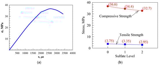 Concrete: (a) stress–strain curve [] and (b) mechanical damaged subjected-to-sulfate attack. Adapted from Al-Rousan et al. [].