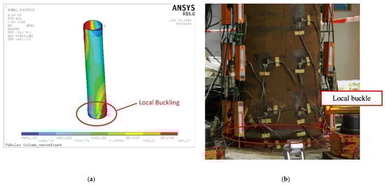 Figure 4 reveals that the FE’s load–drift hysteresis results agree well with those obtained by Yu et al. [], who experimented with a CFT column confined with six CFRP layers (Yu et al. [] designated this column as LCFT-6C-106-F). In addition, there was a significant agreement between the study of Yu et al. [] and this study, in terms of shapes of deformation and modes of failure (Figure 5). After calibration, the FE models were employed to devise 21 FE CFT column models to evaluate the impact of the number of CFRP layers and sulfate level on the models.