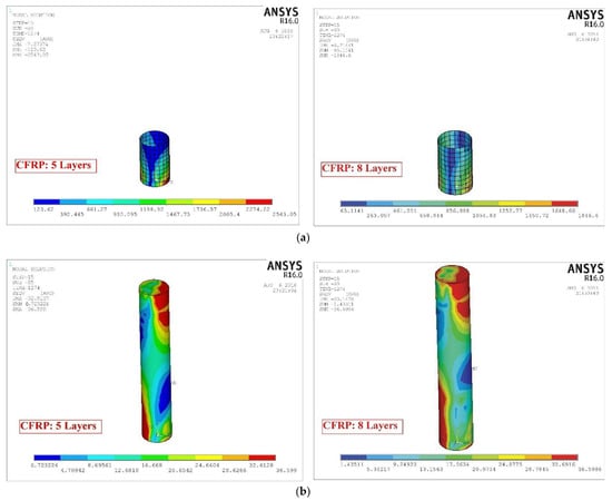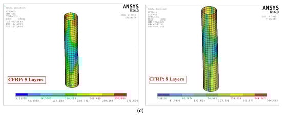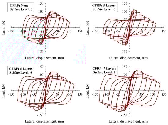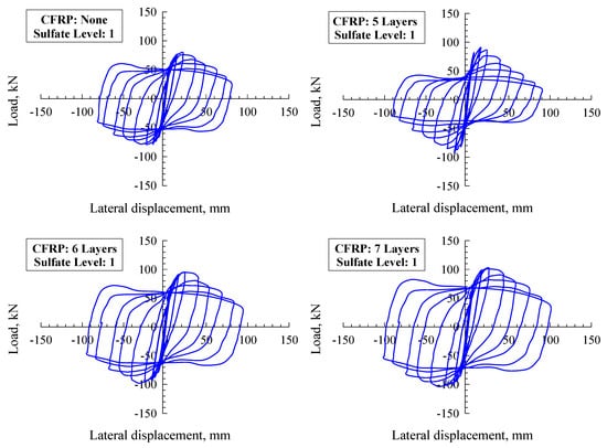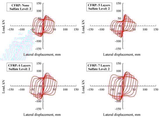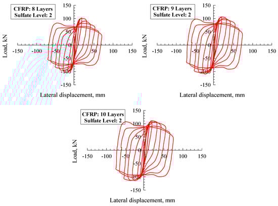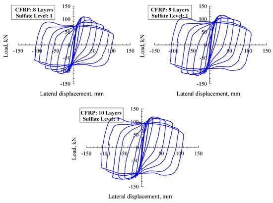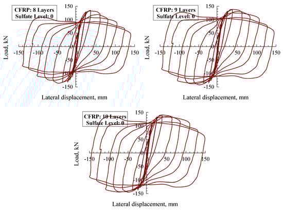 Each of the models was monitored for steel stress contours at each steel tube, CFRP, and core concrete. Figure 6 demonstrates the stress contours for two specimens, CFTC0S1 (i.e., unconfined with CFRP at sulfate level 1) and CFTC8S1 (i.e., confined with eight layers of CFRP, exposed to sulfate level 1), as this figure illustrates the regions with the highest stresses. Further, the CFT column model’s horizontal load–displacement hysteretic loops are demonstrated in Figure 7 (sulfate level 0), Figure 8 (sulfate level 1), and Figure 9 (sulfate level 2). The three figures indicate that the layers of CFRP played a major role in improving the behavior of CFT columns through enhancing energy dissipation, net drift capacity, and lateral load capacity. Referring to Figure 7, it is clearly revealed that the specimen CFTC0S0 (i.e., no CFRP layers and sulfate level 0) had the least horizontal load and displacement. In contrast, the column specimen that was exposed to level 1 of sulfate attack (Figure 8) and the specimen exposed to level 0 of sulfate (Figure 7) were stronger and had larger displacements than the specimen exposed to sulfate level 2, as shown in Figure 9. In addition, referring to Figure 7, Figure 8 and Figure 9, the CFRP’s horizontal load–displacement loops evidently indicate that strengthening CFT columns with CFRP significantly improved the columns’ horizontal displacement and load; the reason of this improvement was that the wraps of CFRP availed the column specimens with an external confinement mechanism when the steel tube reached buckling. Further, Figure 7, Figure 8 and Figure 9 show that the sulfate level strongly impacted the horizontal load–displacement loops; this was because the sulfate level reduced the column specimen’s compressive stress, resulting in tensile stresses in the column, which degraded its strength.