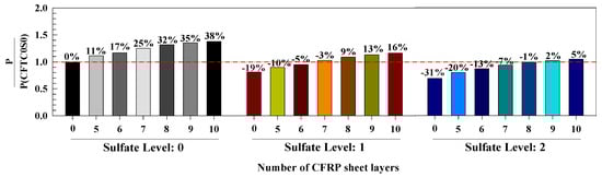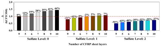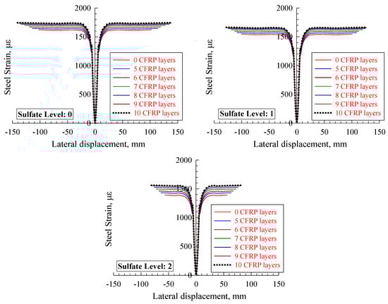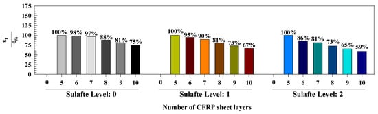 It must be noted that the strain of the reinforcing steel tube was modified as per the strain of yielding in order to highlight the influence of the study parameters on steel strain, as demonstrated in Figure 13. It is revealed from Figure 13 that, at level 0 of sulfate, the strain of the steel tube enhanced by 21%, 23%, 25%, 27%, 29%, 30%, and 30% for zero, five, six, seven, eight, nine, and ten layers, respectively, of CFRP. When exposing the specimens to sulfate level 1, the steel tube’s enhanced by 10%, 14%, 14%, 15%, 16%, 18%, and 18% when using zero, five, six, seven, eight, nine, and ten layers of CFRP, respectively. Additionally, at sulfate level 2, the results show that the steel tube’s strain increased by 1%, 4%, 6%, 8%, 10%, 12%, and 13% when using zero, five, six, seven, eight, nine, and ten layers of CFRP, respectively. The findings show that the specimens exposed to level 2 of sulfate had the least enhancement in the steel tube’s strain when the CFRP layers were increased. In addition, it has been found that the strain of the steel tube increased in a proportional manner when the number of CFRP layers was raised up to eight layers, whereas increasing the number of layers to nine or ten had no significant effect. Hence, it can be concluded that using eight CFRP layers is the most efficient at enhancing the models’ performance.