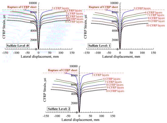 Figure 14 demonstrates the relation between the horizontal displacement and the CFRP strain behavior for the strengthened-with-CFRP CFT column models. The response curve has two stages: the first represents horizontal displacements from 0 to 10 mm, and the second represents displacements from 10 mm to failure. Considering Figure 14, there was a rapid increase in CFRP strain and a minimal improvement in horizontal displacement. In comparison, the rise in CFRP strain was slight with a rapid increase in horizontal displacement. In addition, Figure 15 shows that, at sulfate level 0, increasing the layers of CFRP resulted in a reduction in CFRP strain by 100% (rupture) when zero CFRP layers were used, 98% (2% reduction) at five layers, 97% (3% reduction) at six layers, 88% (12% reduction) at seven layers, 81% (19% reduction) at eight layers, and 75% (25% reduction) at nine layers. However, at sulfate level 1, the strain of CFRP reduced when the number of CFRP layers was raised, as follows: 5%, 10%, 19%, 27%, and 33% at five, six, seven, eight, nine, and ten layers, respectively. At sulfate level 2, the strain of CFRP had the most minor reduction when the number of CFRP layers was increased, as follows: 14%, 19%, 27%, 35%, and 41%, at five, six, seven, eight, nine, and ten layers, respectively. In addition, the steel tube strain was enhanced in a proportional manner when the number of CFRP layers was raised to eight to ten layers; the enhancement was barely noticed when using nine and ten layers, which indicated that eight layers of CFRP was optimal. Hence, the sulfate level reduced the CFRP strain by an average of 13% at sulfate level 0, 20% at level 1, and 28% at level 2. Lastly, using less than five layers of CFRP did not significantly improve the models’ CFRP strain.