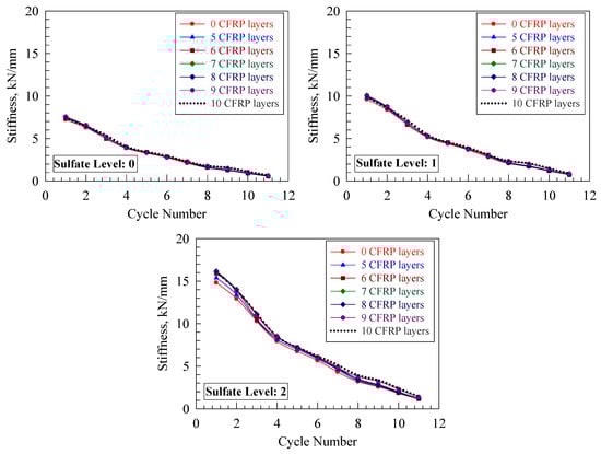At every cycle, the stiffness was computed; the obtained values were graphically plotted to investigate the relation between the CFT column models’ stiffness and the number of cycles, as depicted in Figure 15. Inspecting Figure 16, it can be observed that there was a sharp slope in the stiffness degradation response versus the number of cycles graph when a strengthened-with-CFRP column model was used under 0% axial load. Then, upon raising the axial load, the slope became less sharp; the reason for this was that the axial load level availed the area between footing and column with excellent confinement. In addition, the results reveal that using CFRP to strengthen the CFT column barely enhanced the column’s initial stiffness and the number of cycles. Therefore, sulfate level of the column decreased initial stiffness and number of cycles as well as increased the sharpness of stiffness degradation due to the decrease in column compressive stress. Moreover, the level of sulfate reduced the degradation of stiffness by nearly 41% at sulfate level 1 and 62% at sulfate level 2 compared to that at sulfate level 0.