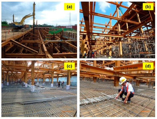 Different stages of the LPHP basement construction: (a) the soil excavation, (b) the horizontal steel strut members and steel pin piles, (c) the bottom foundation, and (d) the B3 floor inspected by the corresponding author.