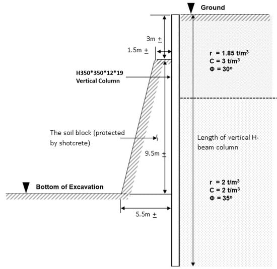For comparison with the LPHP and A7PHB-C, the authors present the A7PHB-D project, which was the same development project referred to in Case 1. The contractor of this project was different to that of A7PHB-C and LPHP. Basic information in this project, such as the subsurface condition, excavation depth, and groundwater level, was similar to that of A7PHB-C and the LPHP; however, the retaining method selected by the contractor was different in this project from the other two projects. The retaining system was a combination of vertical H-beam columns and soil blocks that were protected by shotcrete. Figure 4 shows the vertical section and the soil profile of the retaining system for the A7PHB-D project.